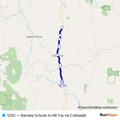The first stop of the S242 bus route is Hilltop Property, Cobbadah Rd and the last stop is Barraba Central School, Edward St. S242 (Barraba Schools to Hill Top via Cobbadah) is operational during entre semana.