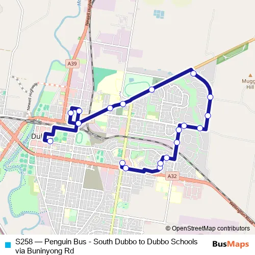 The first stop of the S258 bus route is Orana Mall, Wheelers Lane and the last stop is Dubbo Public School, Wingewarra St. S258 (Penguin Bus - South Dubbo to Dubbo Schools via Buninyong Rd) is operational during entre semana.