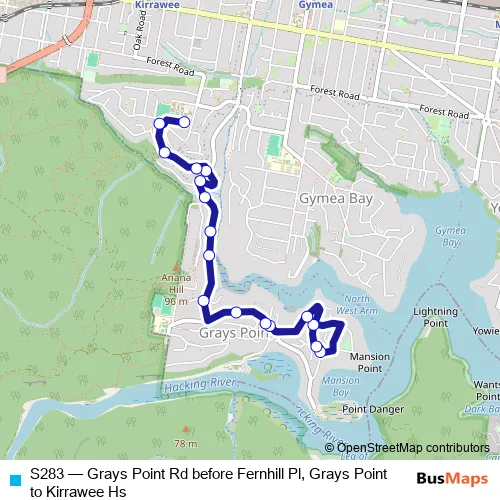 The first stop of the S283 bus route is Grays Point Rd Opp Grays Point Community Hall and the last stop is Kirrawee High School, Duneba Av. S283 (Grays Point Rd before Fernhill Pl, Grays Point to Kirrawee Hs) is operational during entre semana.