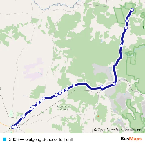 The first stop of the S303 bus route is All Hallows Primary Schools, Bayly St and the last stop is Ulan Rd At Cliffdale Rd. S303 (Gulgong Schools to Turill) is operational during entre semana.