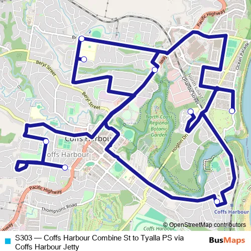 Click here to view the nearest S303 - Coffs Harbour Combine St to Tyalla PS via Coffs Harbour Jetty bus stop.
