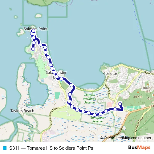 The first stop of the S311 bus route is Tomaree Education Centre, Bays 1-3 and the last stop is Soldiers Point Public School, Cromarty Rd. S311 (Tomaree HS to Soldiers Point Ps) is operational during entre semana.