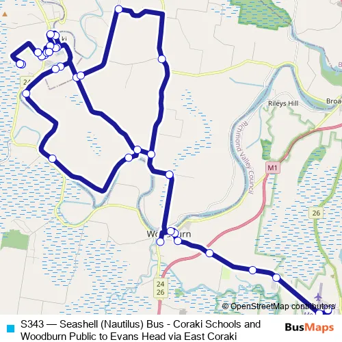 The first stop of the S343 bus route is Buslines Depot, Memorial Airport Dr and the last stop is St Joseph's Catholic School, Adams St. S343 (Seashell (Nautilus) Bus - Coraki Schools and Woodburn Public to Evans Head via East Coraki) is operational during entre semana.