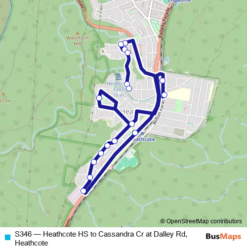The first stop of the S346 bus route is Wilson Pde Opp Heathcote High School and the last stop is Cassandra Cres At Dalley Rd. S346 (Heathcote HS to Cassandra Cr at Dalley Rd, Heathcote) is operational during entre semana.
