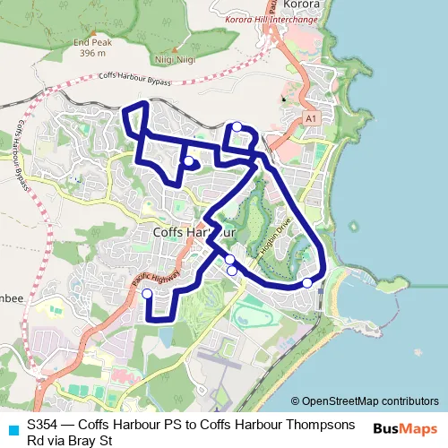 The first stop of the S354 bus route is Coffs Harbour Public School, Salamander St and the last stop is Thompsons Park, Thompsons Rd. S354 (Coffs Harbour PS to Coffs Harbour Thompsons Rd via Bray St) is operational during entre semana.
