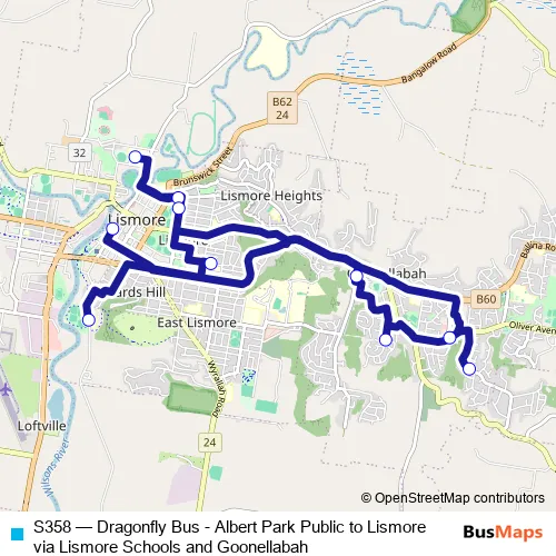 The first stop of the S358 bus route is Albert Park Public School, Keen St and the last stop is Lismore Transit Centre, Molesworth St. S358 (Dragonfly Bus - Albert Park Public to Lismore via Lismore Schools and Goonellabah) is operational during entre semana.