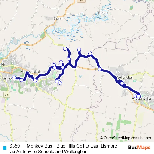 The first stop of the S359 bus route is Blue Hills College, Blue Hills Av and the last stop is Military Rd After Industry Dr. S359 (Monkey Bus - Blue Hills Coll to East Lismore via Alstonville Schools and Wollongbar) is operational during entre semana.