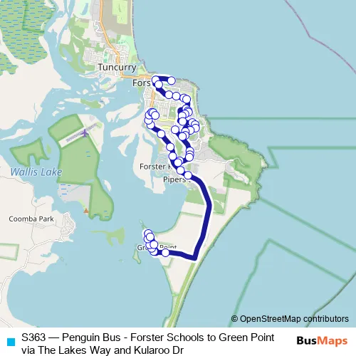 The first stop of the S363 bus route is Forster Public School, Head St and the last stop is Forster Buslines Depot, Kularoo Dr. S363 (Penguin Bus - Forster Schools to Green Point via The Lakes Way and Kularoo Dr) is operational during entre semana.