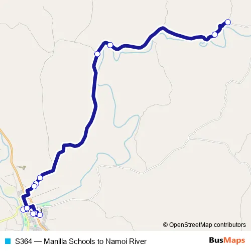 The first stop of the S364 bus route is Namoi River Rd Opp Windfall Property and the last stop is St Michael's Catholic Primary School, Court St. S364 (Manilla Schools to Namoi River) is operational during entre semana.