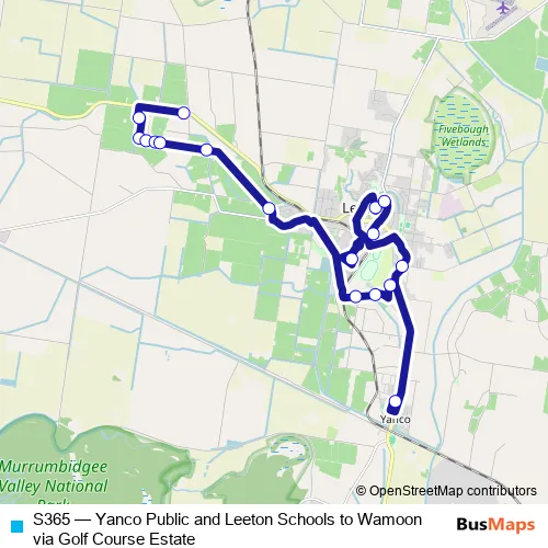Click here to view the nearest S365 - Yanco Public and Leeton Schools to Wamoon via Golf Course Estate bus stop.