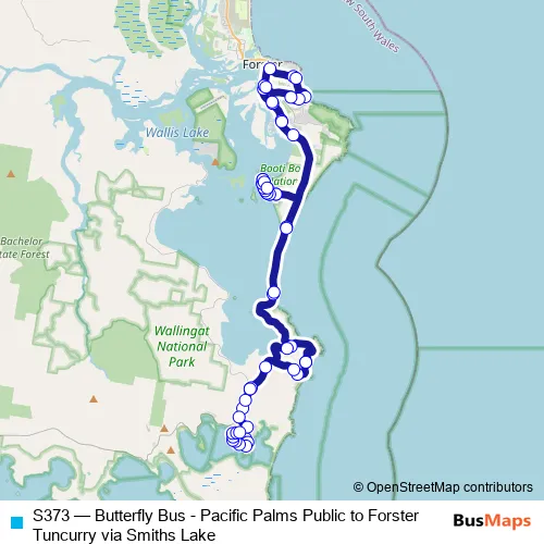 Click here to view the nearest S373 - Butterfly Bus - Pacific Palms Public to Forster Tuncurry via Smiths Lake bus stop.