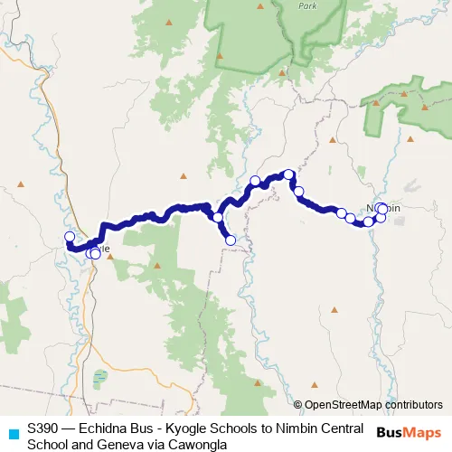 The first stop of the S390 bus route is Wiangaree Back Rd After Saville Rd and the last stop is Kyogle Public School, Groom St. S390 (Echidna Bus - Kyogle Schools to Nimbin Central School and Geneva via Cawongla) is operational during entre semana.