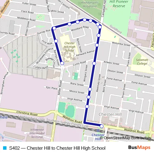 The first stop of the S402 bus route is Chester Hill Station, Waldron Rd and the last stop is Chester Hill High School, Miller Rd. S402 (Chester Hill to Chester Hill High School) is operational during entre semana.