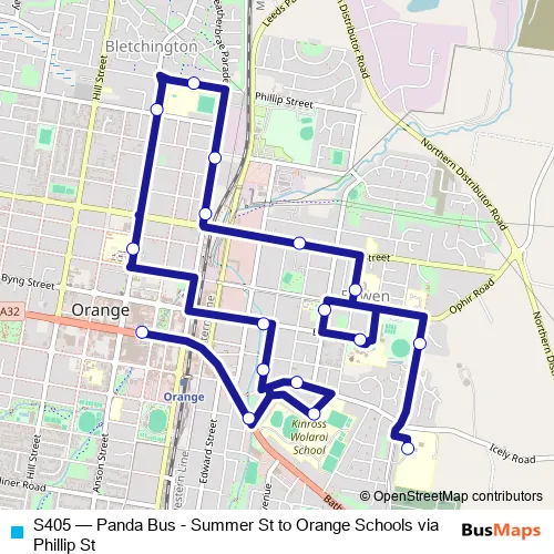 The first stop of the S405 bus route is Summer St Before Lords Pl and the last stop is The Canobolas Rural Technology High School, Blackley St. S405 (Panda Bus - Summer St to Orange Schools via Phillip St) is operational during entre semana.