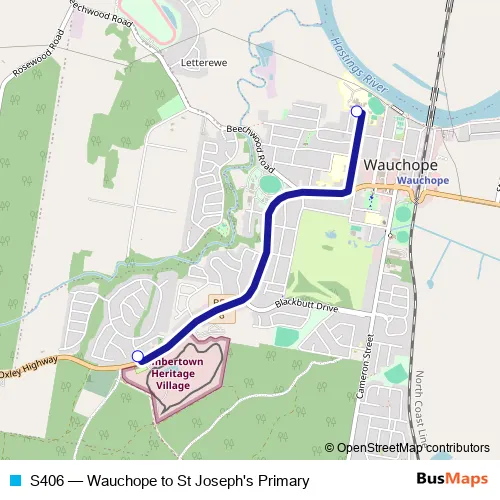 The first stop of the S406 bus route is Forest Way After Oxley Hwy and the last stop is Wauchope High School, Nelson St. S406 (Wauchope to St Joseph's Primary) is operational during entre semana.
