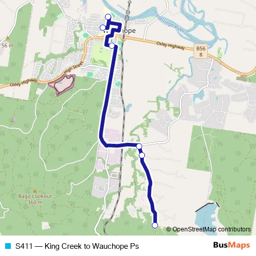 The first stop of the S411 bus route is Old King Creek Rd At Arranbee Rd and the last stop is Wauchope Public School, Waugh St. S411 (King Creek to Wauchope Ps) is operational during entre semana.