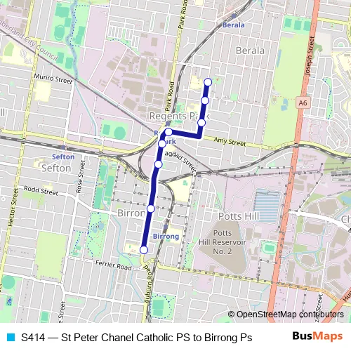 The first stop of the S414 bus route is Kingsland Rd Opp St Peter Chanel Church and the last stop is Auburn Rd Opp Birrong Public School. S414 (St Peter Chanel Catholic PS to Birrong Ps) is operational during entre semana.
