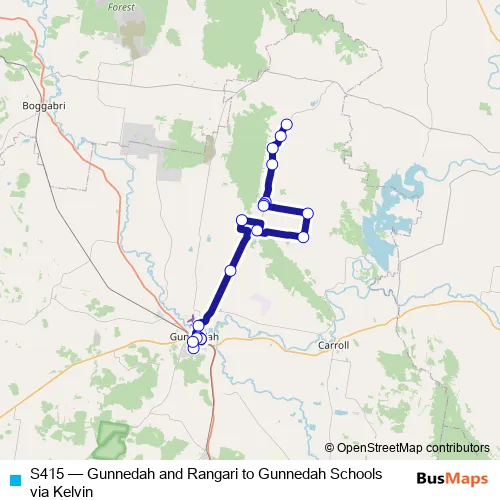 The first stop of the S415 bus route is Bridges Rd At Kelvin Rd and the last stop is Gunnedah High School, Marquis St. S415 (Gunnedah and Rangari to Gunnedah Schools via Kelvin) is operational during entre semana.