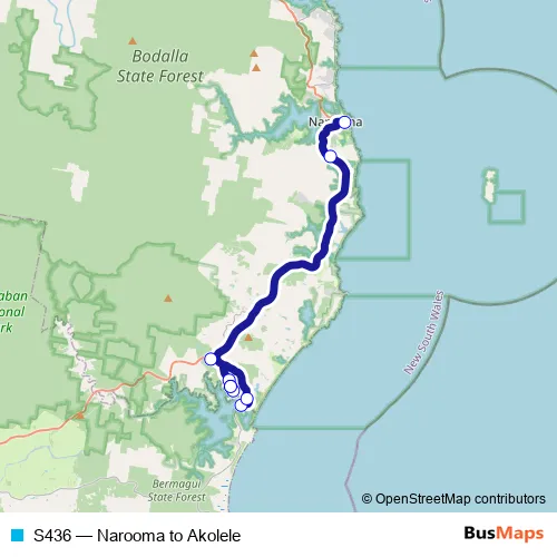 The first stop of the S436 bus route is Payne's Island, Wallaga Lake Rd and the last stop is Narooma Public School, Montague St. S436 (Narooma to Akolele) is operational during entre semana.
