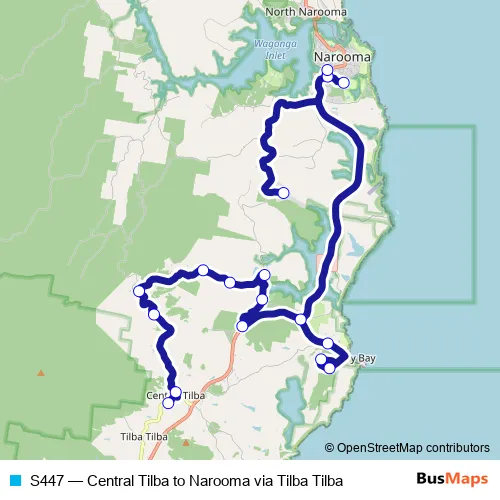 The first stop of the S447 bus route is Central Tilba Public School, Corkhill Dr and the last stop is 52 Corunna Rd. S447 (Central Tilba to Narooma via Tilba Tilba) is operational during entre semana.