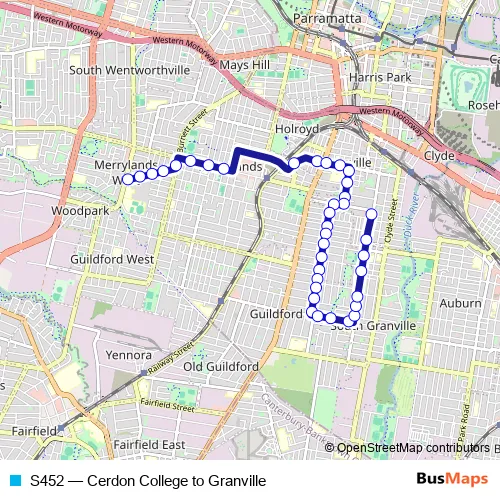 The first stop of the S452 bus route is Kenyons Rd Opp Cerdon College and the last stop is Blaxcell St Opp Charles St. S452 (Cerdon College to Granville) is operational during entre semana.