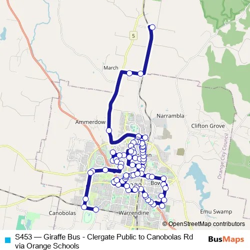 Click here to view the nearest S453 - Giraffe Bus - Clergate Public to Canobolas Rd via Orange Schools bus stop.
