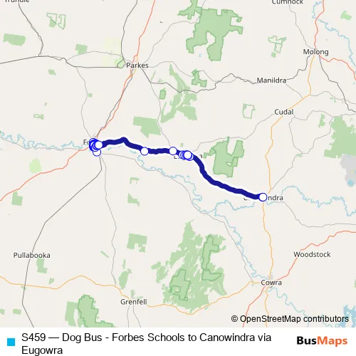 Click here to view the nearest S459 - Dog Bus - Forbes Schools to Canowindra via Eugowra bus stop.