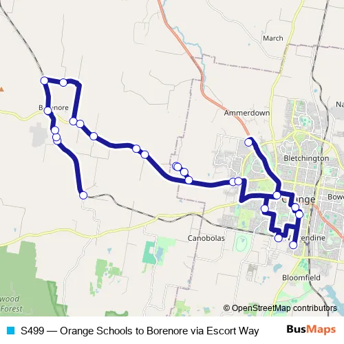 The first stop of the S499 bus route is Borenore Rd Turnaround and the last stop is Orange Anglican Grammar School. S499 (Orange Schools to Borenore via Escort Way) is operational during entre semana.