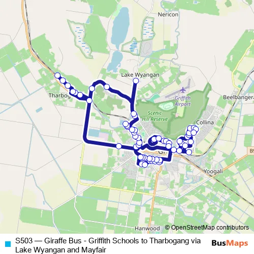 Click here to view the nearest S503 - Giraffe Bus - Griffith Schools to Tharbogang via Lake Wyangan and Mayfair bus stop.
