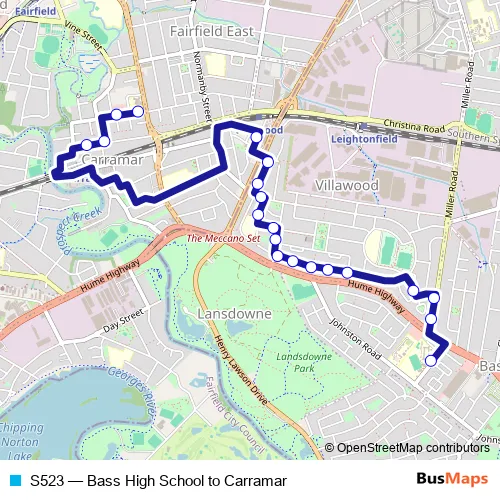The first stop of the S523 bus route is Bass High School, Arundle Rd and the last stop is Fairfield Community Health Centre, Mitchell St. S523 (Bass High School to Carramar) is operational during entre semana.