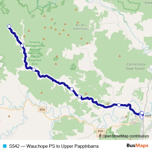 The first stop of the S542 bus route is Wauchope Public School, Campbell St and the last stop is Pappinbarra Road Left Arm At Flaretys Trail. S542 (Wauchope PS to Upper Pappinbarra) is operational during entre semana.
