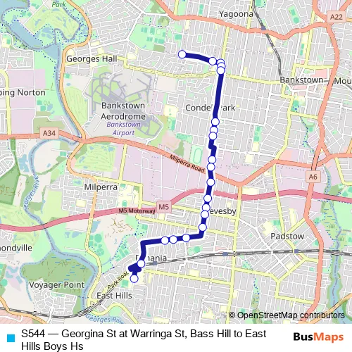 The first stop of the S544 bus route is Georgina St At Warringa St and the last stop is East Hills Boys High School, Lucas Rd. S544 (Georgina St at Warringa St, Bass Hill to East Hills Boys Hs) is operational during entre semana.