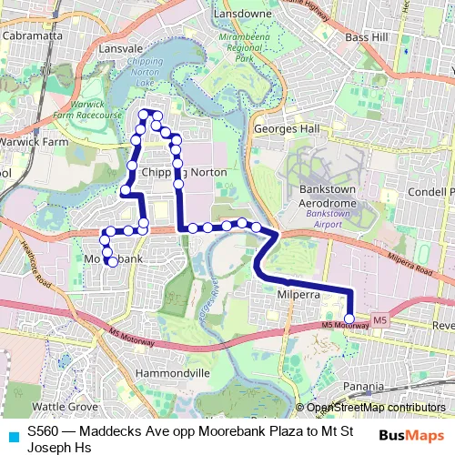 The first stop of the S560 bus route is Maddecks Av Opp Moorebank Shopping Village and the last stop is Horsley Rd After Beaconsfield St. S560 (Maddecks Ave opp Moorebank Plaza to Mt St Joseph Hs) is operational during entre semana.