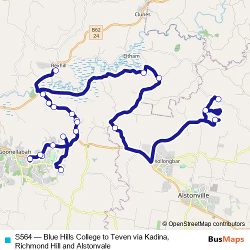 The first stop of the S564 bus route is Blue Hills College, Blue Hills Av and the last stop is Eltham Rd After Pearces Ck Rd. S564 (Blue Hills College to Teven via Kadina, Richmond Hill and Alstonvale) is operational during entre semana.