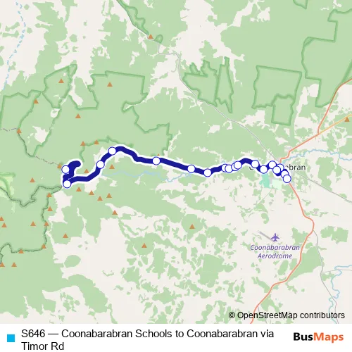 Services on the S646 - Coonabarabran Schools to Coonabarabran via Timor Rd bus stop at 08:39 on lunes, martes, miércoles, jueves, viernes.