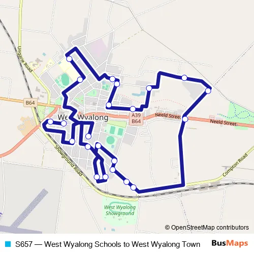 The first stop of the S657 bus route is St Mary's War Memorial School, England St and the last stop is Court St At Golden St. S657 (West Wyalong Schools to West Wyalong Town) is operational during entre semana.