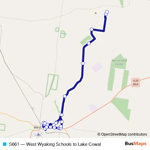 The first stop of the S661 bus route is Wyalong Public School, George Bland Av and the last stop is 3074 Clear Ridge Rd. S661 (West Wyalong Schools to Lake Cowal) is operational during entre semana.