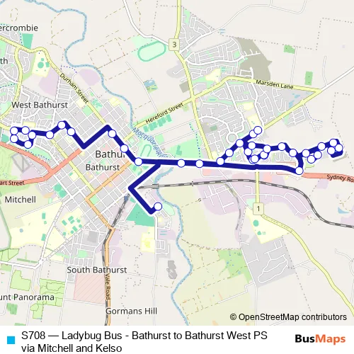 The first stop of the S708 bus route is Lyal St Opp Bathurst Buslines Depot and the last stop is Bathurst West Public School, Suttor St. S708 (Ladybug Bus - Bathurst to Bathurst West PS via Mitchell and Kelso) is operational during entre semana.