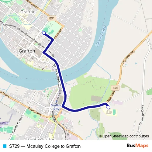 The first stop of the S729 bus route is Mcauley Catholic College, Hennessy Dr and the last stop is Oliver St Opp Presbyterian Church. S729 (Mcauley College to Grafton) is operational during entre semana.