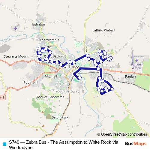 The first stop of the S740 bus route is The Assumption School, Mitre St and the last stop is Bathurst Buslines Depot, Lyal St. S740 (Zebra Bus - The Assumption to White Rock via Windradyne) is operational during entre semana.