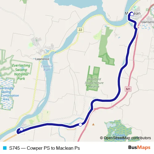 The first stop of the S745 bus route is Cowper Public School, Clarence St and the last stop is Maclean Public School, Woodford St. S745 (Cowper PS to Maclean Ps) is operational during entre semana.