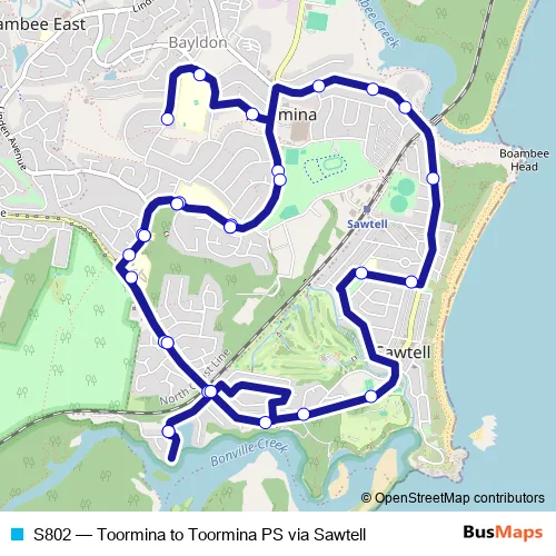The first stop of the S802 bus route is Toormina Rd After Hobbs Cres and the last stop is Toormina Public School, Cavanba Rd. S802 (Toormina to Toormina PS via Sawtell) is operational during entre semana.