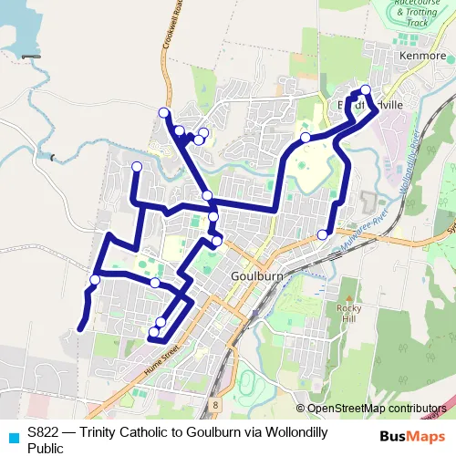The first stop of the S822 bus route is Fitzroy St After Kinghorne St and the last stop is St Josephs Primary School, Lagoon St. S822 (Trinity Catholic to Goulburn via Wollondilly Public) is operational during entre semana.