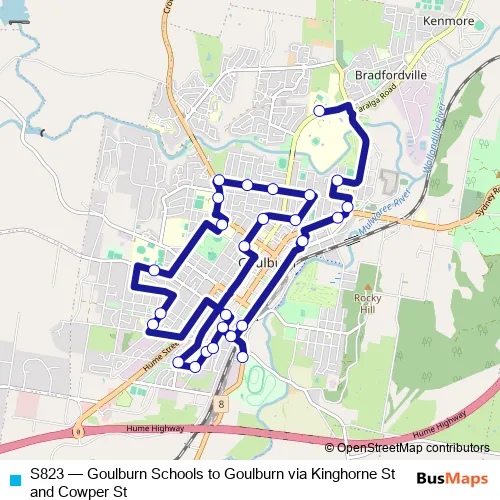 The first stop of the S823 bus route is Mulwaree High School, Mcdermott Dr and the last stop is Sloane St Before Glebe Av. S823 (Goulburn Schools to Goulburn via Kinghorne St and Cowper St) is operational during entre semana.