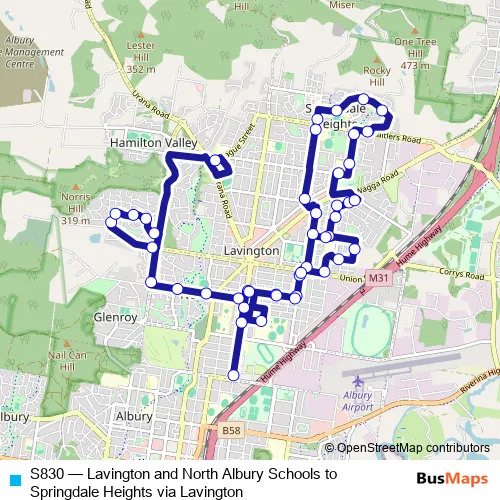 Click here to view the nearest S830 - Lavington and North Albury Schools to Springdale Heights via Lavington bus stop.