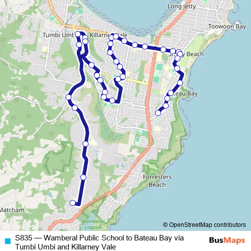 The first stop of the S835 bus route is Wamberal Public School, Aldinga Dr and the last stop is Bateau Bay Rd Opp Papala Av. S835 (Wamberal Public School to Bateau Bay via Tumbi Umbi and Killarney Vale) is operational during entre semana.