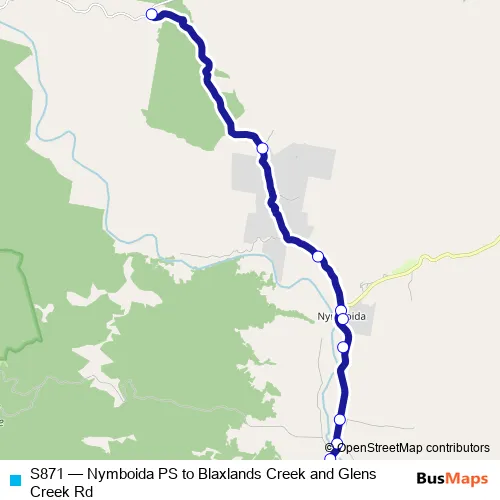 The first stop of the S871 bus route is Glens Creek Rd Opp Old Glen Innes Rd and the last stop is Nymboida Public School. S871 (Nymboida PS to Blaxlands Creek and Glens Creek Rd) is operational during entre semana.