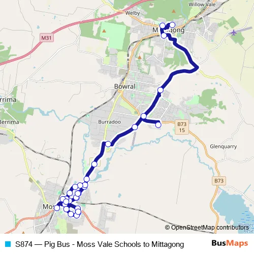 The first stop of the S874 bus route is St Michael's Catholic Primary School, Alfred St and the last stop is Moss Vale Court House, Argyle St. S874 (Pig Bus - Moss Vale Schools to Mittagong) is operational during entre semana.
