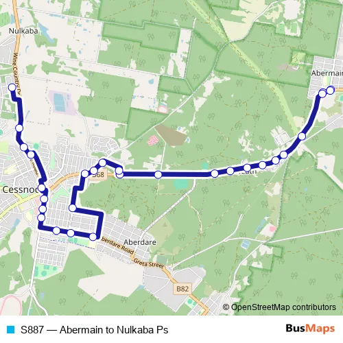 The first stop of the S887 bus route is Cessnock Rd At Goulburn St and the last stop is Nulkaba Public School, Branxton St. S887 (Abermain to Nulkaba Ps) is operational during entre semana.