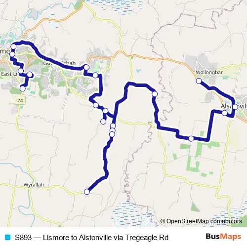 The first stop of the S893 bus route is Wyrallah Rd Opp Wyrallah Road Public School and the last stop is Lismore Rd Before Opp Range Rd. S893 (Lismore to Alstonville via Tregeagle Rd) is operational during entre semana.